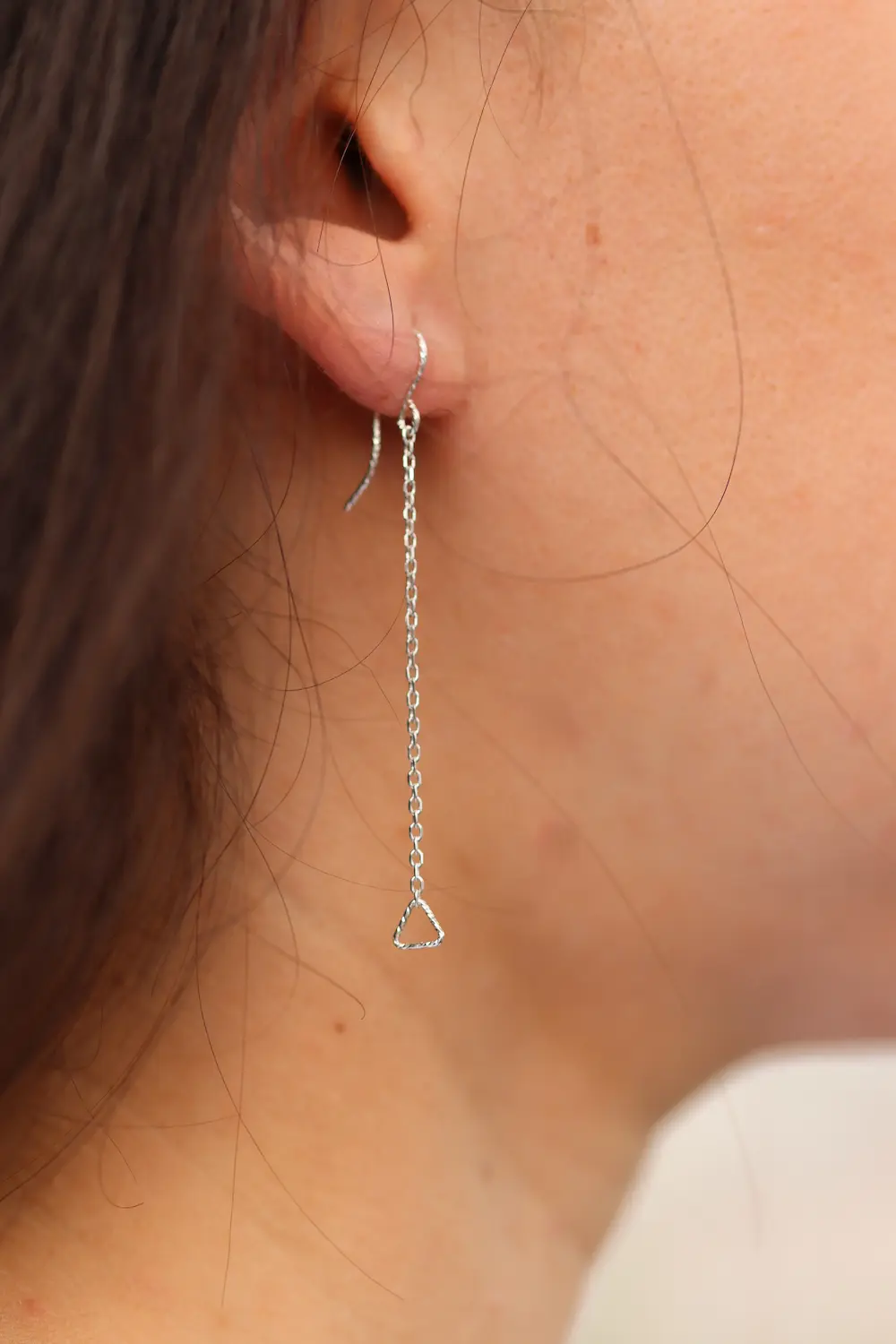 Boucles d’Oreilles, tout en finesse, avec de fines chaînes, de petits triangles scintillants et des attaches texturées qui ajoutent une touche de brillance subtile à chaque mouvement.
