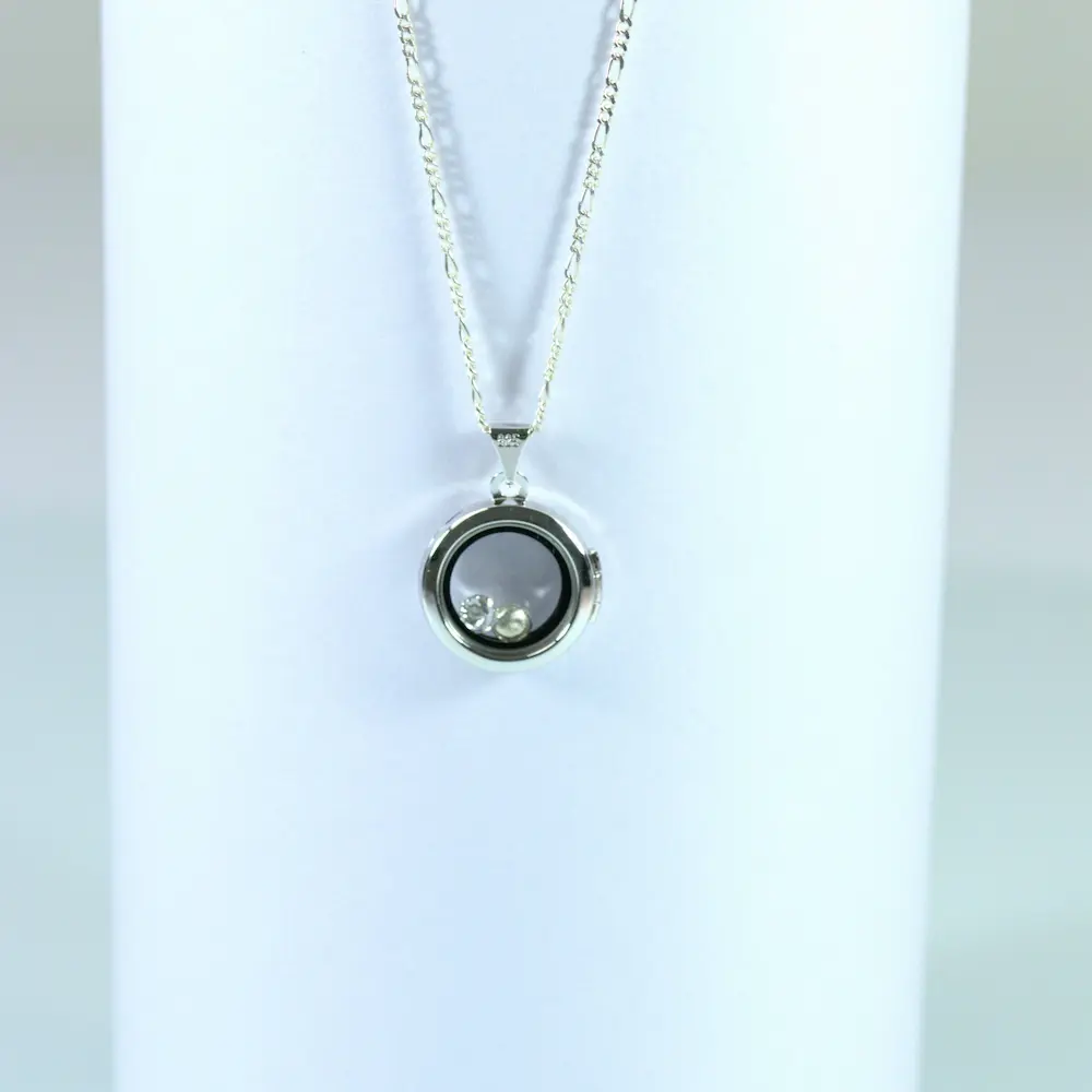 La chaîne mesure 90 cm (tombé 45 cm) et le pendentif transparent 1,5 cm de diamètre.